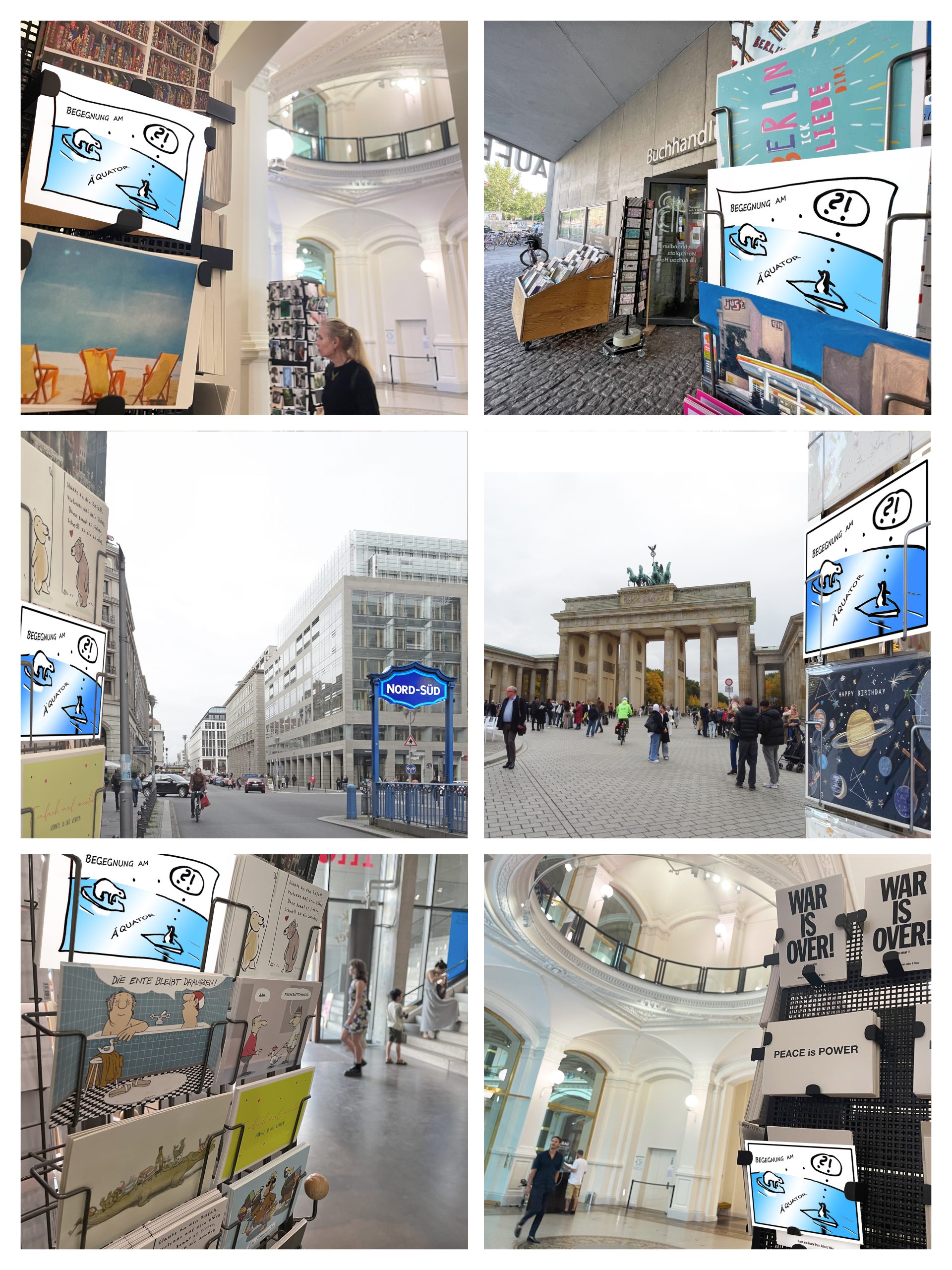 B: The accompanying communication concept with a surprise effect: visitors randomly find the pre-stamped postcards in high-traffic locations (museum shops, bookstores, postcard stands, etc.) and are invited to send them - thereby communicating the urgency of sustainable behavioral change.