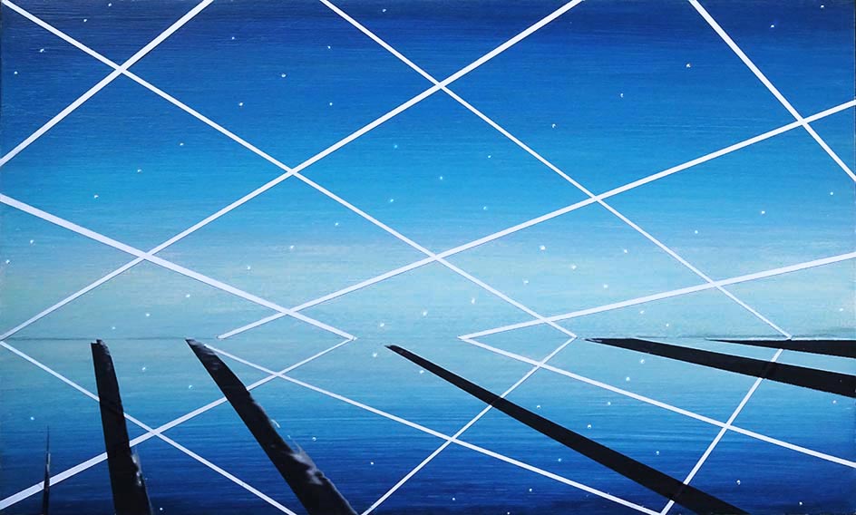 Unter heiterem Himmel, Spargelfeld in Brandenburg (Parlament der Lichter) / Under a clear sky, asparagus field in Brandenburg (Parliament of Lights), 2025, Acryl und Collage auf Holz, 21 x 34,6 cm